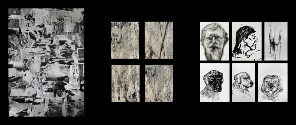 1. kolaż, 2. monotypia, 3. szkice/rysunki węglem i tuszem